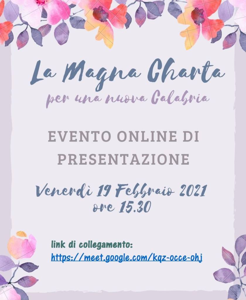 È indetta per venerdì 19 febbraio 2021, alle ore 15.30, la Conferenza stampa di presentazione del Manifesto “La Magna Charta per una nuova Calabria” che si svolgerà sulla piattaforma Google Meet al link di accesso: https://meet.google.com/kqz-occe-ohj .